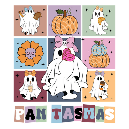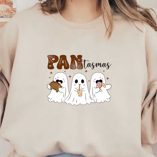 Un gráfico alegre que presenta tres adorables fantasmas disfrutando de bocadillos y bebidas, acompañado del texto divertido "PAN-tasmas".