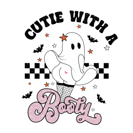 Ilustración de un fantasma divertido con una pose atrevida, con un patrón de red de pesca y el divertido lema "Booty" en rosa.