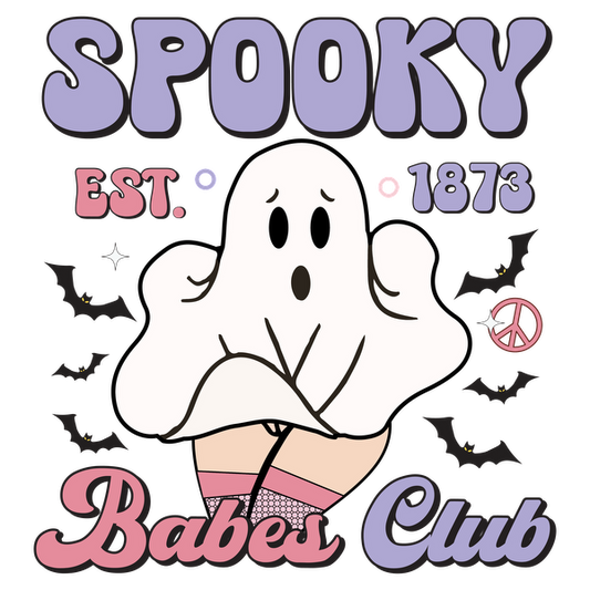 Un diseño divertido que presenta un fantasma de dibujos animados, con el texto "Spooky Babes Club" y una fecha vintage de 1873.