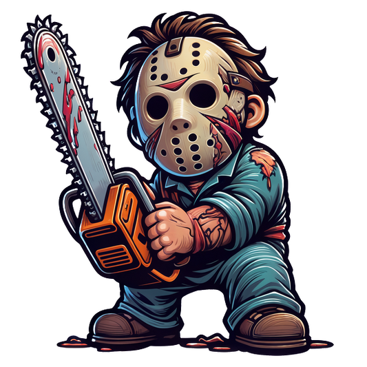 Un personaje divertido y caricaturesco con una máscara y una motosierra, que presenta un atuendo informal con un toque de temática de terror.