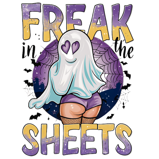 Un gráfico divertido con temática de Halloween que presenta un fantasma con ojos en forma de corazón, acompañado por el texto "Freak in the Sheets".