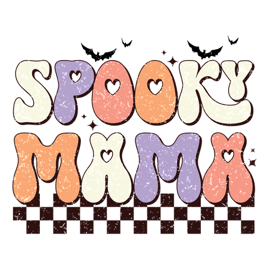 Un diseño divertido que presenta la frase "Spooky Mamma" en letras coloridas y burbujeantes, perfecto para un ambiente festivo de Halloween.