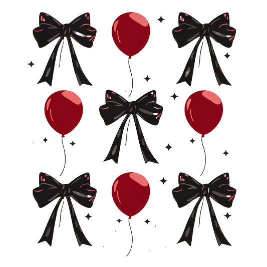 Un patrón divertido con globos rojos y lazos negros, perfecto para celebraciones festivas o decoraciones de fiestas.