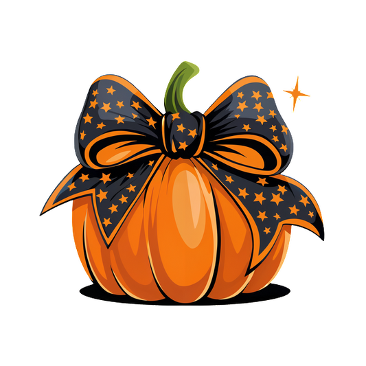 ¡Una calabaza naranja festiva adornada con un elegante lazo negro con patrones de estrellas, perfecta para decoraciones de Halloween!