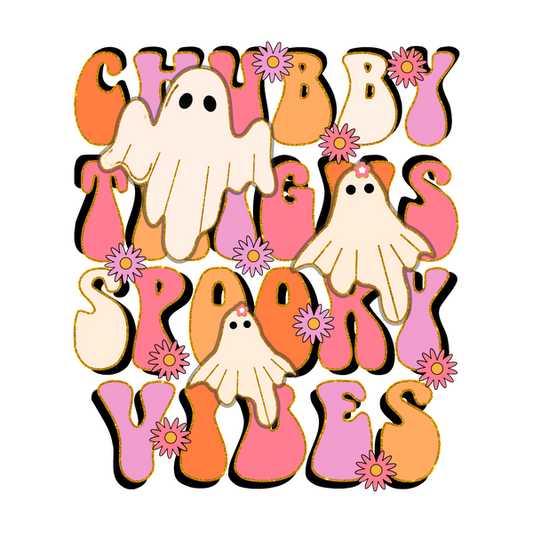 Lindo diseño retro con fantasmas regordetes y un texto divertido que dice "Chubby Things, Spoony Vibes", ¡perfecto para Halloween!