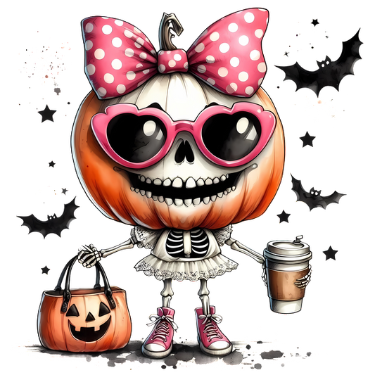 Un personaje caprichoso con cabeza de calabaza, cuerpo de esqueleto, lazo rosa y gafas de sol, sosteniendo un café y una bolsa de mano.