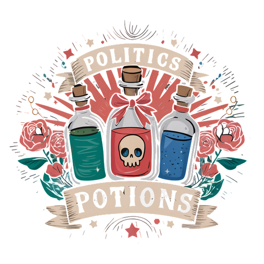 Precio habitual A partir de £0.75 GBPPrecio habitualPrecio unitario / por£2.41 GBPPrecio de oferta A partir de £0.75 GBPUna ilustración caprichosa que presenta tres frascos de pociones etiquetados como "Pociones políticas", rodeados de flores y elementos de diseño vibrantes.