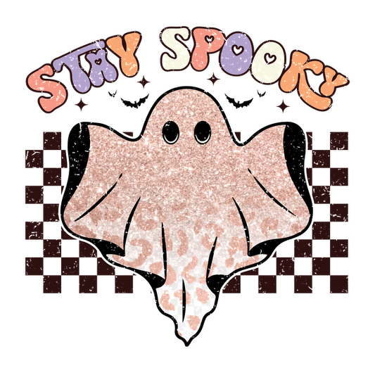 ¡Una linda y brillante ilustración de fantasma con las palabras "Stay Spooky", perfecta para una decoración con temática de Halloween!