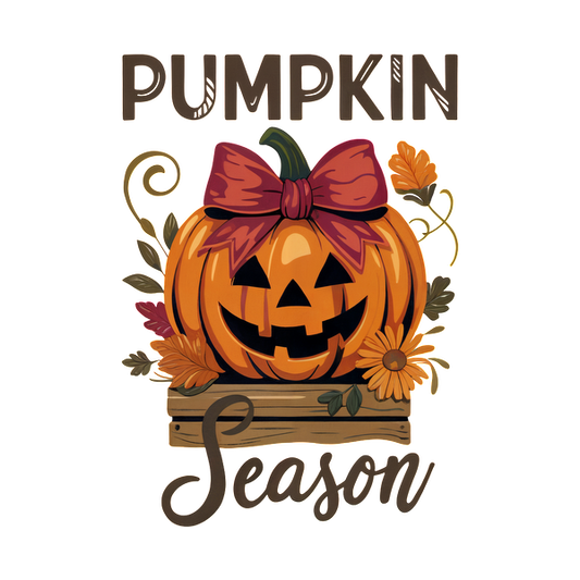 Ilustración brillante y alegre que presenta una calabaza sonriente con un lazo, celebrando la festiva "Temporada de calabazas" rodeada de flores de otoño.