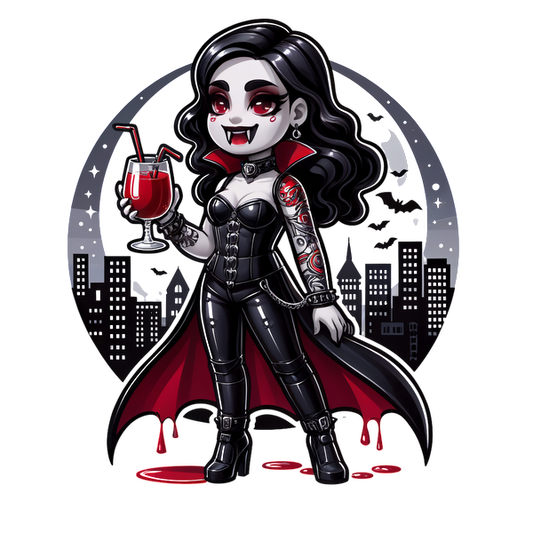 Precio habitual A partir de £0.75 GBPPrecio habitualPrecio unitario / por£2.41 GBPPrecio de oferta A partir de £0.75 GBPUn elegante vampiro de dibujos animados con un atuendo negro brillante y una capa roja disfruta de una bebida con el horizonte de una ciudad como telón de fondo.