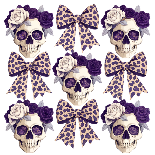 Una divertida variedad de calaveras decorativas adornadas con flores violetas y elegantes lazos con estampado de leopardo, que combinan diversión y elegancia.