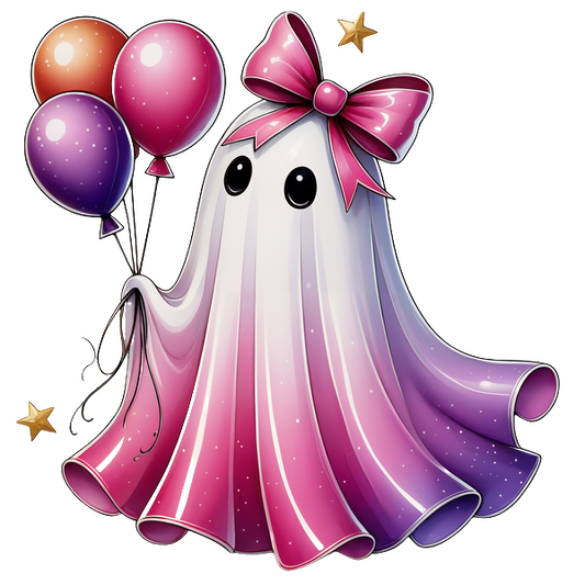 Un lindo fantasma caricaturesco con un lazo rosa y globos coloridos, que presenta un diseño ombré caprichoso en rosa y morado.