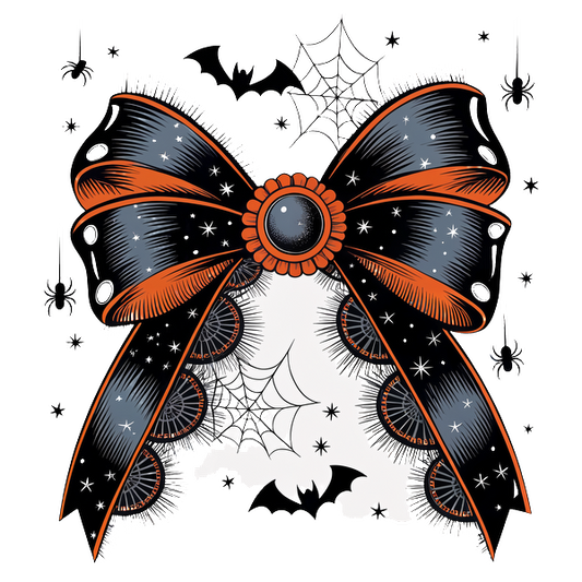 Un lazo festivo de Halloween con un diseño negro y naranja, adornado con una gema central y rodeado de telarañas y murciélagos.