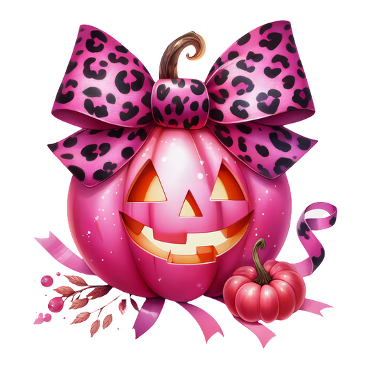 Precio habitual A partir de £0.75 GBPPrecio habitualPrecio unitario / por£2.41 GBPPrecio de oferta A partir de £0.75 GBPUna linda calabaza rosa con un lazo de estampado de leopardo y una cara sonriente, rodeada de calabazas más pequeñas y elementos decorativos.