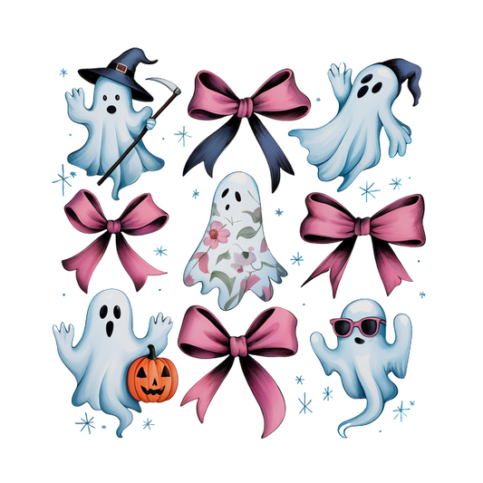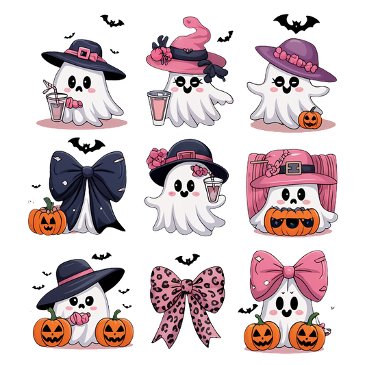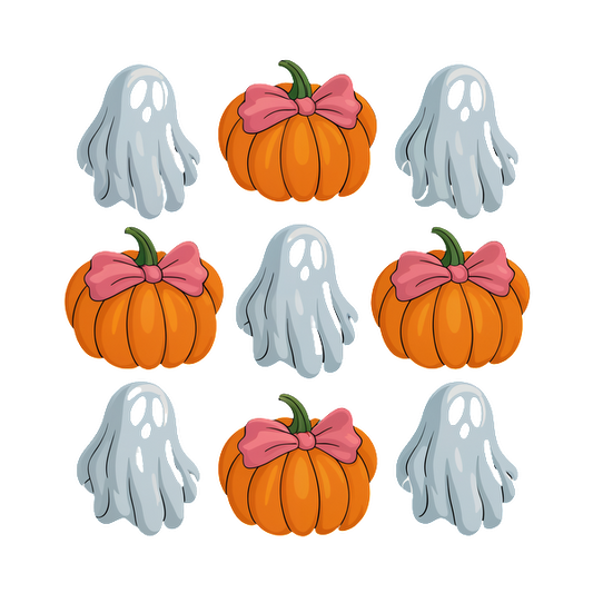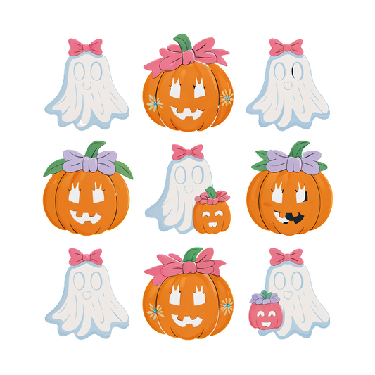Un divertido conjunto con temática de Halloween que presenta lindos fantasmas y calabazas adornadas con moños, perfecto para decoraciones de temporada.
