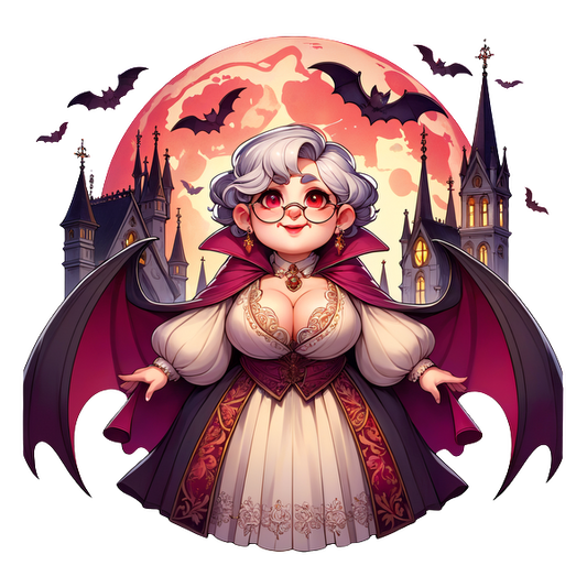Precio habitual A partir de £0.75 GBPPrecio habitualPrecio unitario / por£2.41 GBPPrecio de oferta A partir de £0.75 GBPUna encantadora dama vampiro con cabello plateado y gafas se encuentra frente a un espeluznante castillo como telón de fondo, celebrando Halloween.