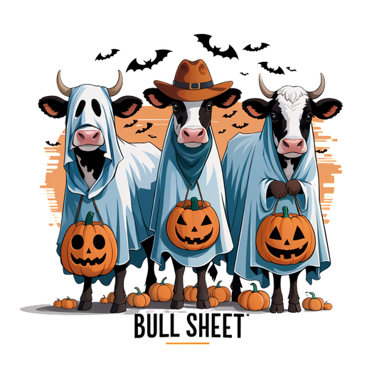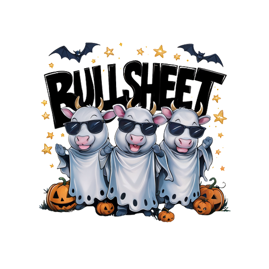Un divertido diseño con temática de Halloween que presenta tres vacas disfrazadas de fantasmas y con gafas de sol, rodeadas de calabazas y murciélagos juguetones.