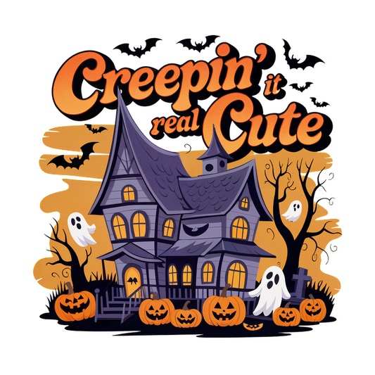 Una divertida ilustración con temática de Halloween que presenta una casa espeluznante, fantasmas divertidos, calabazas y la frase "Creepin' it real Cute".