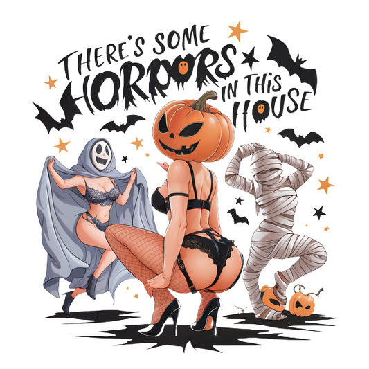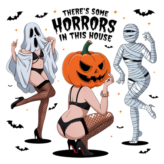 Este divertido diseño con temática de Halloween presenta a tres mujeres con disfraces espeluznantes, sobre un fondo extravagante que reza "horrores en esta casa".