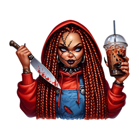 Un personaje feroz con cabello trenzado, que sostiene un cuchillo ensangrentado en una mano y una bebida en la otra, y viste una sudadera con capucha roja.