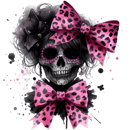 Una elegante ilustración de calavera adornada con atrevidos lazos con estampado de leopardo en tonos rosas y negros, que combinan elementos atrevidos y divertidos.