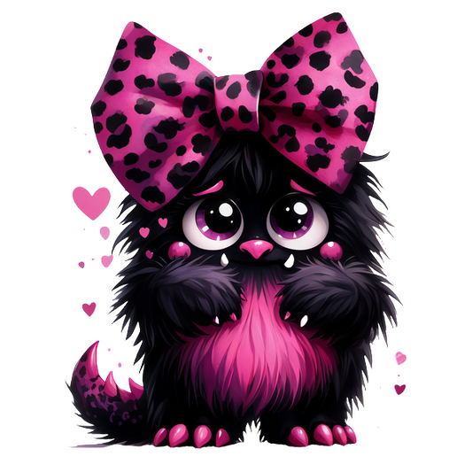 ¡Esta adorable criatura negra presenta un lazo con estampado de leopardo rosa brillante, ojos grandes y expresivos y un diseño esponjoso que irradia ternura!