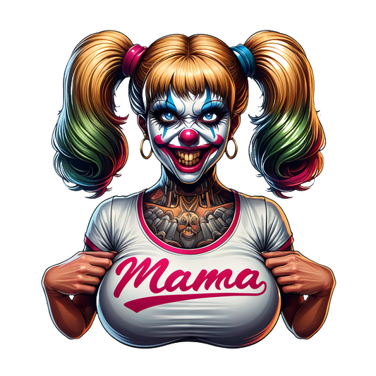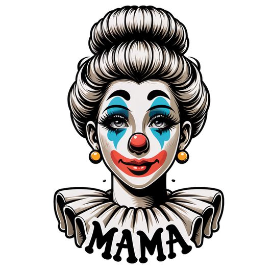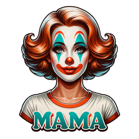 Una divertida ilustración de payaso que presenta una alegre figura con maquillaje colorido, cabello peinado y una camiseta que muestra audazmente la palabra "MAMA".