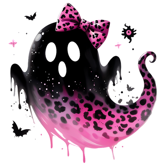 Este lindo fantasma presenta un diseño con estampado de leopardo negro y rosa con un lazo encantador, creando una apariencia divertida y caprichosa.