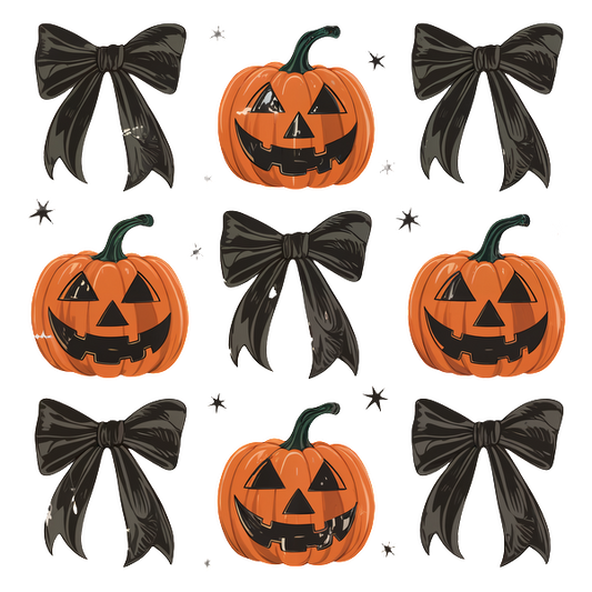 Un diseño divertido con temática de Halloween que incluye alegres linternas de calabaza y elegantes lazos negros dispuestos en un patrón de cuadrícula.