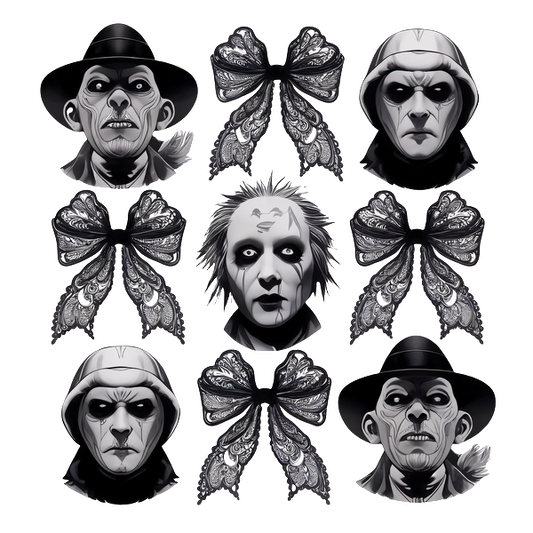 Un gráfico llamativo que presenta caras de personajes estilizadas rodeadas de elegantes lazos, combinando temas de terror con detalles intrincados.