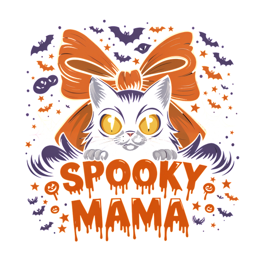 Un divertido diseño de Halloween que presenta un lindo gato negro con un gran lazo naranja, rodeado de decoraciones espeluznantes y el texto "Spooky Mama".