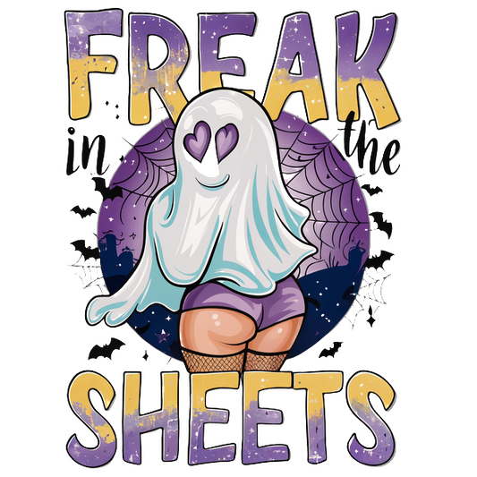 Un gráfico divertido con temática de Halloween que presenta una figura fantasma con ojos en forma de corazón y la frase "Freak in the Sheets".