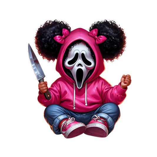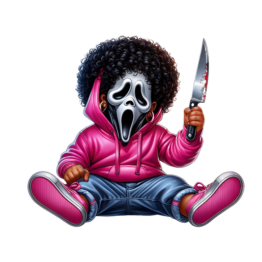 Un simpático personaje de dibujos animados que presenta una máscara de terror clásica, viste una sudadera con capucha rosa y sostiene un cuchillo, con coletas divertidas.