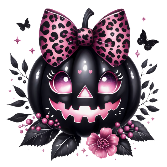 Una divertida calabaza negra con un lazo con estampado de leopardo, con lindos ojos y rodeada de flores y hojas rosas.