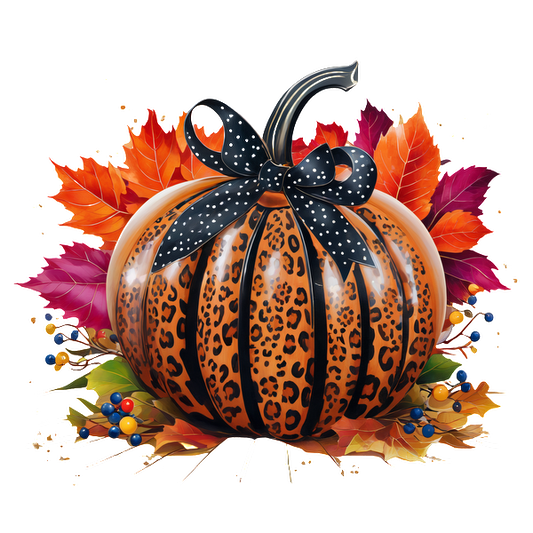 Una elegante calabaza con estampado de leopardo adornada con un lazo de lunares negros, rodeada de coloridas hojas y bayas otoñales.