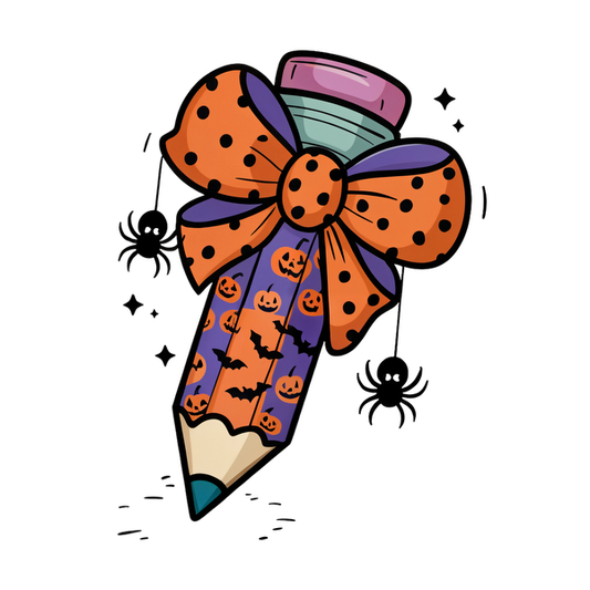 Este divertido lápiz presenta un diseño festivo de Halloween con patrones de calabaza, un lazo de lunares naranjas y una divertida combinación de colores.