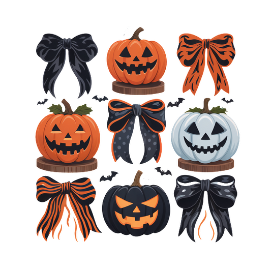 Una colorida colección de calabazas y lazos con temática de Halloween, con diseños sonrientes y espeluznantes en naranja, negro y blanco.