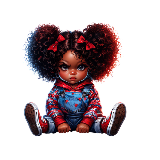Esta adorable muñeca tiene cabello grande y rizado, lazos rojos brillantes y está vestida con un colorido atuendo con estampado de estrellas y zapatillas deportivas.