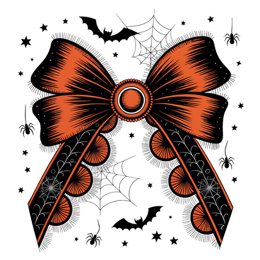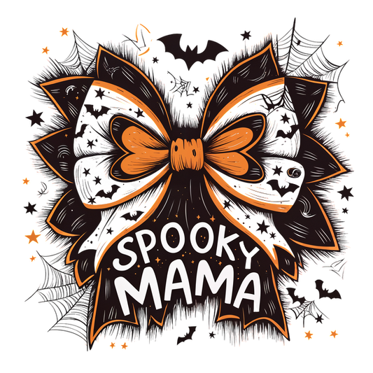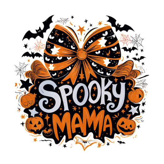 Una vibrante ilustración con temática de Halloween que presenta un gran lazo negro y naranja con el texto "Spooky Mama" en una fuente divertida.