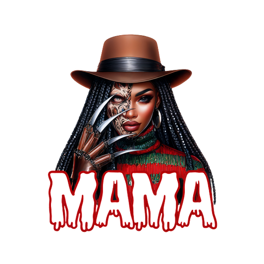Una ilustración feroz y elegante de una mujer con trenzas, un sombrero de vaquero y garras metálicas, con el texto en negrita "MAMA".