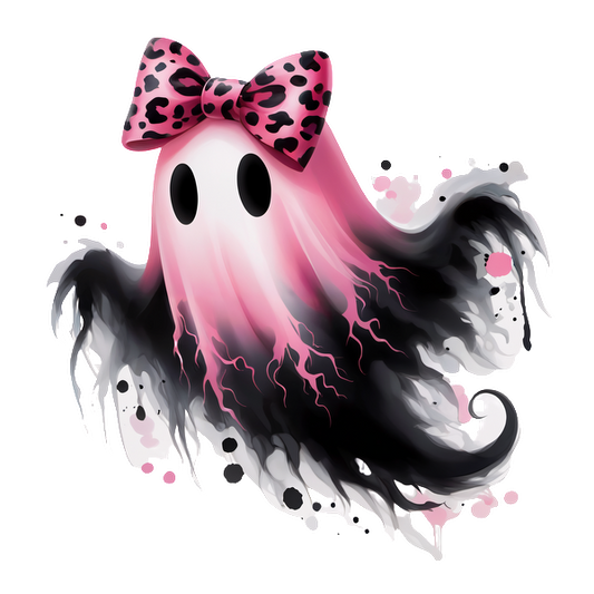 Un lindo personaje fantasma con un lazo con estampado de leopardo rosa, que presenta una combinación de colores rosa y negro para una apariencia divertida.