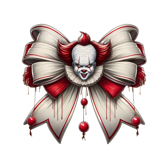 Una cabeza de payaso caprichosa con cabello rojo brillante, enmarcada por un gran lazo blanco, presenta detalles en rojo que gotean para darle un toque espeluznante.