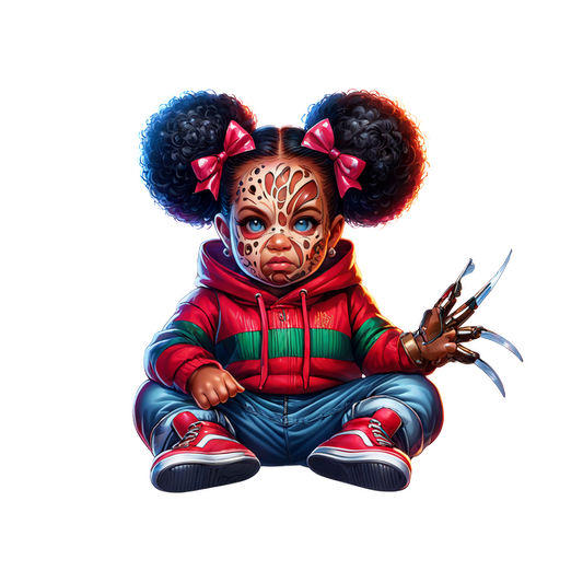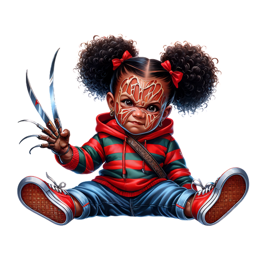 Una ilustración divertida y única de un niño pequeño con una mirada feroz, con un atuendo elegante y garras afiladas.