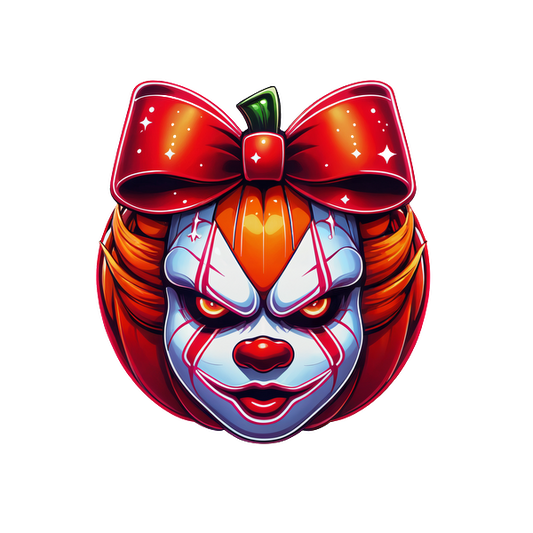Una ilustración vibrante y espeluznante de una cara de payaso combinada con una calabaza, adornada con un gran lazo rojo.