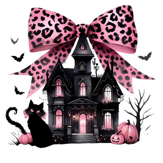 Una extravagante casa embrujada negra adornada con un lazo con estampado de leopardo rosa, calabazas, un gato negro y murciélagos.