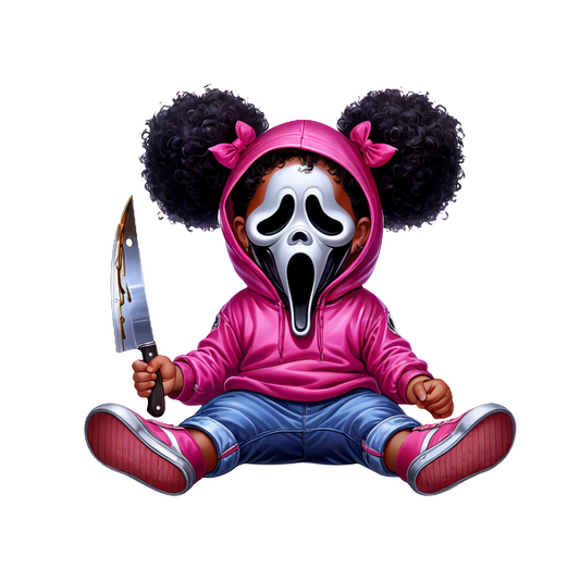 Una representación caprichosa de un niño con una sudadera con capucha rosa y jeans, usando una máscara espeluznante y sosteniendo un cuchillo.