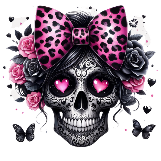 Una calavera bellamente decorada con un lazo con estampado de leopardo rosa, rodeada de rosas y mariposas vibrantes, que irradia una vibra divertida.