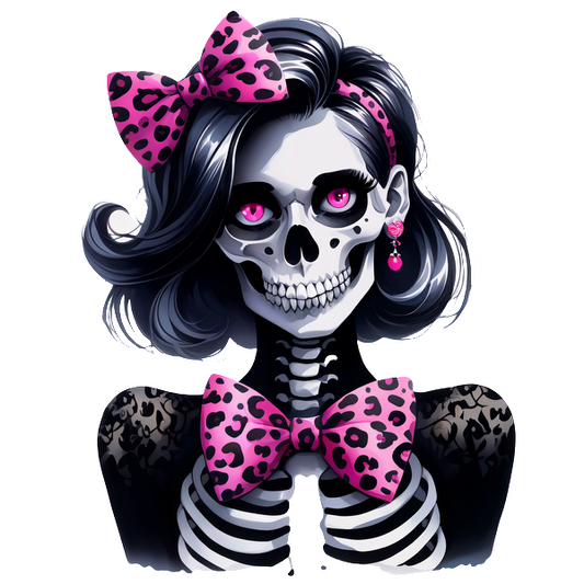 Un esqueleto elegante con un lazo con estampado de leopardo de moda, completo con detalles rosas y aretes, que irradia una onda divertida.