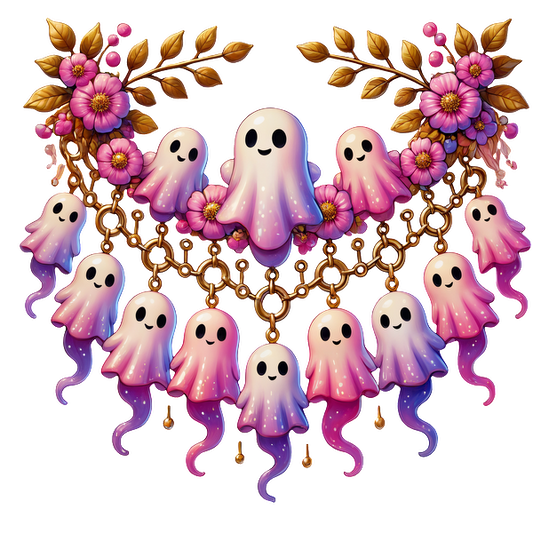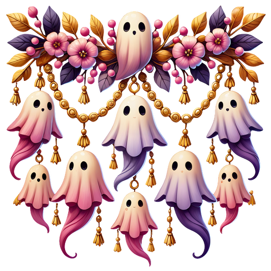 Una decoración caprichosa con coloridas ilustraciones de fantasmas, detalles florales y cuentas colgantes, perfecta para un ambiente festivo y divertido.