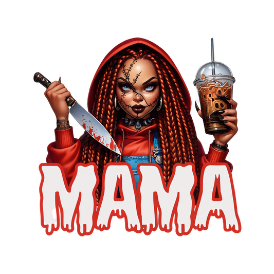 Una feroz ilustración de una mujer con cabello trenzado, sosteniendo un cuchillo y una bebida, con el texto en negrita "MAMA".